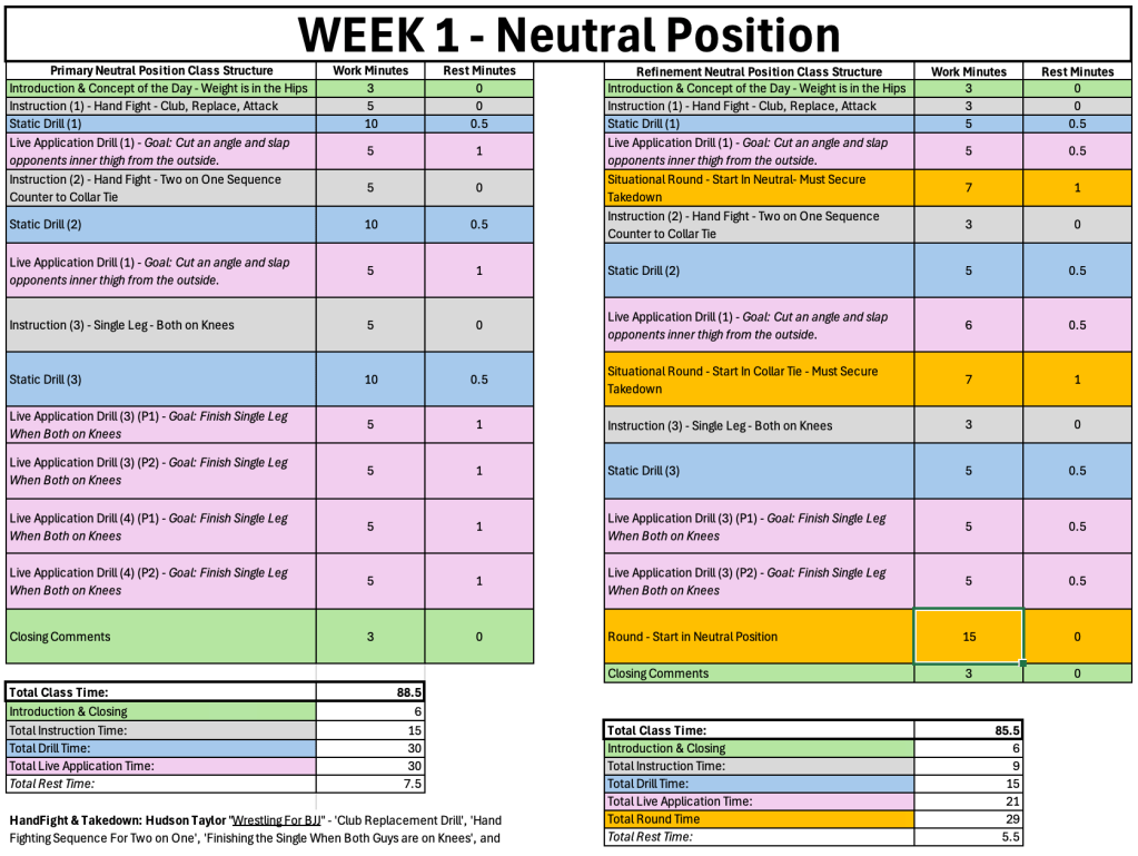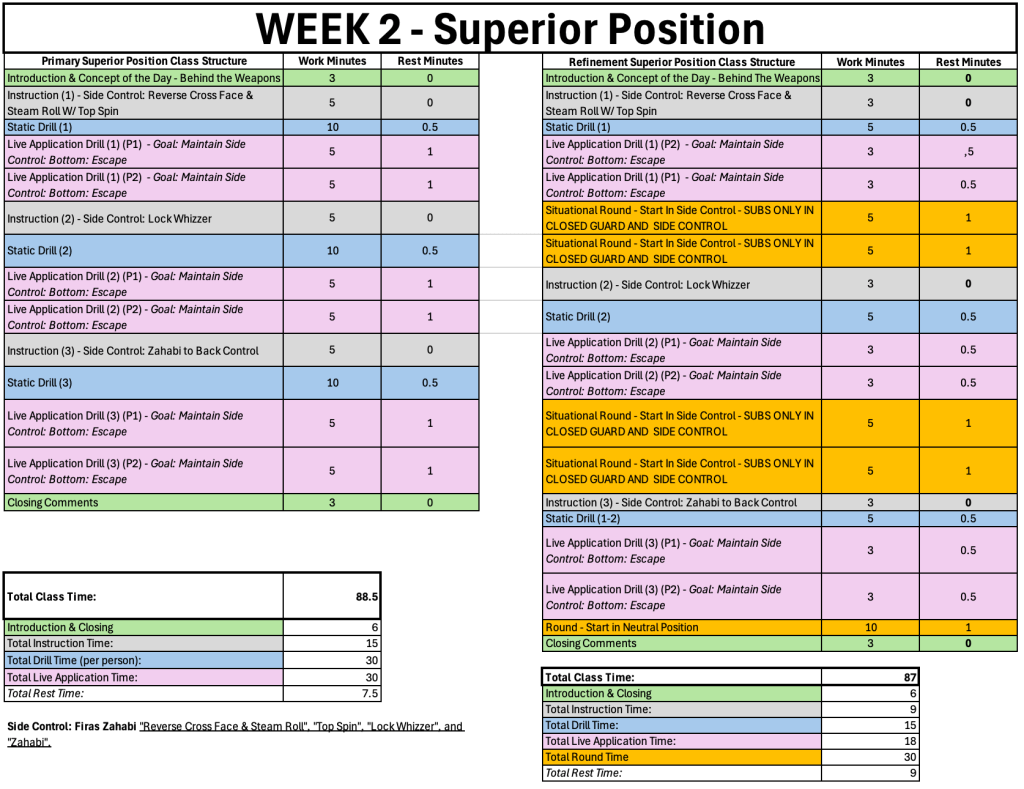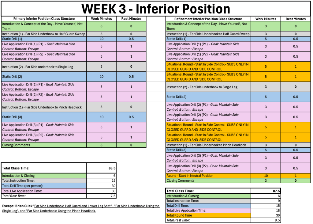 You learned the moves in the class before, now it’s time to really work on refinement and optimization. Drill the move, work on live application scenarios, then attempt them in situational rounds. The refinement comes from your partner providing you feedback in the drill and live application, then applying that feedback in a situational round. You then return the favor, iterating multiple times to take your technique to the next level.